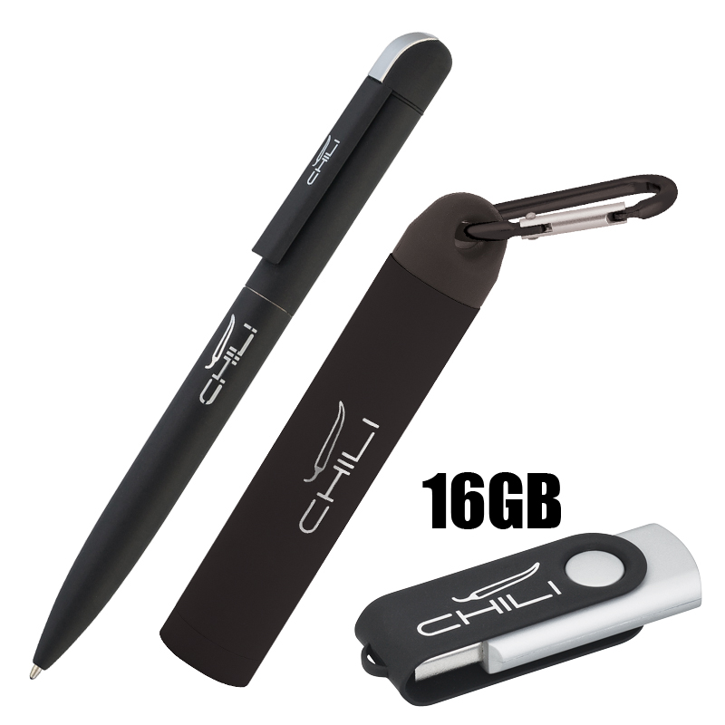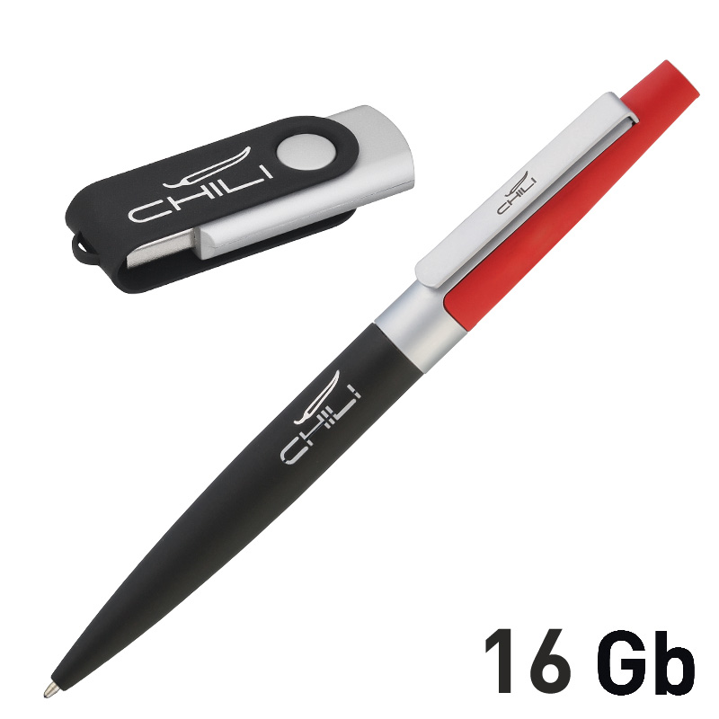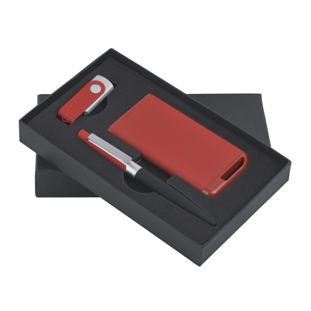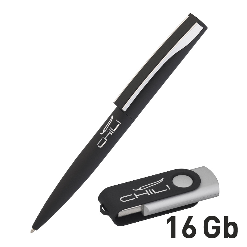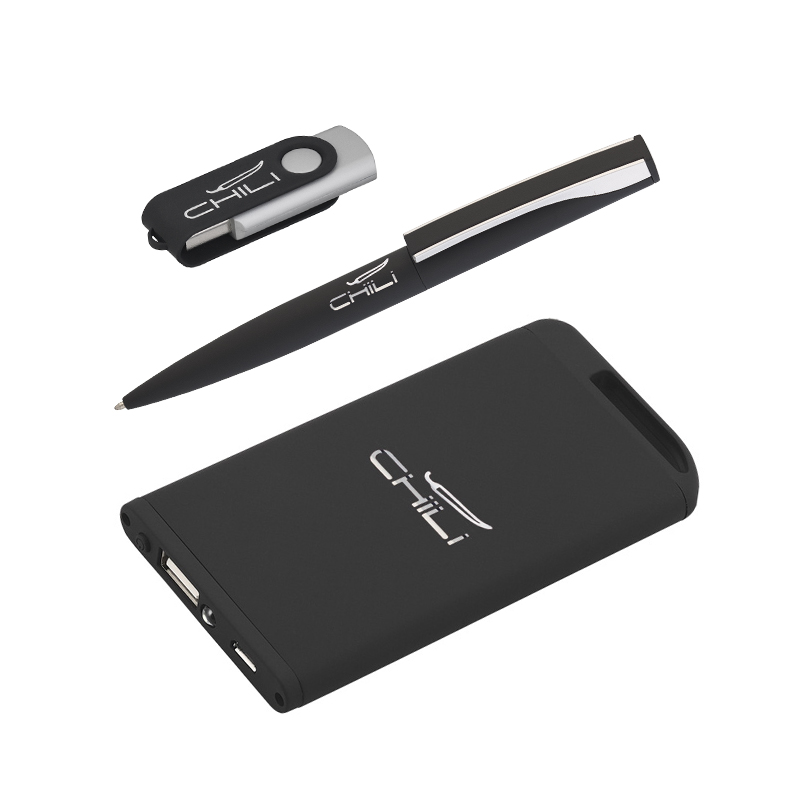 Набор ручка + флеш-карта 16Гб + зарядное устройство 2800 mAh в футляре, покрытие soft touch